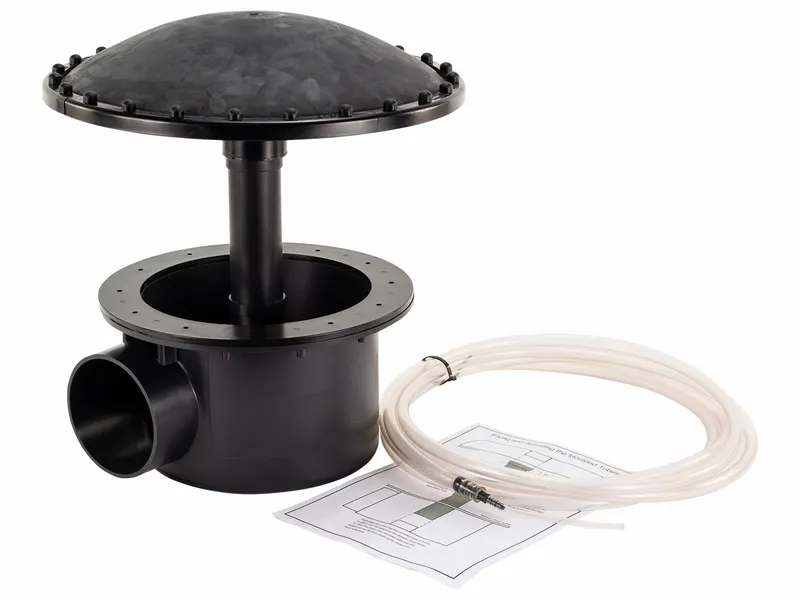 Bodemdrain 110mm voorzien van deksel met rubber membraan voor het beluchten van vijvers. Diameter deksel is 38cm (luchtmembraan diameter 34cm). Geadviseerde luchttoevoer is 20 liter per meter waterdiepte. Luchtaansluiting is 9mm.