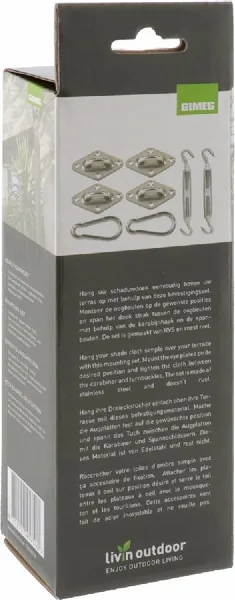 Voor een optimale levensduur en stevige bevestiging is het belangrijk om je Livin’outdoor schaduwdoek goed te bevestigen. Met deze bevestigingsset speciaal gemaakt voor de vierkante schaduwdoeken is dat een fluitje van een cent! De bevestigingsset bestaat uit twee karabijnhaken, twee spanners en vier platen met oog.