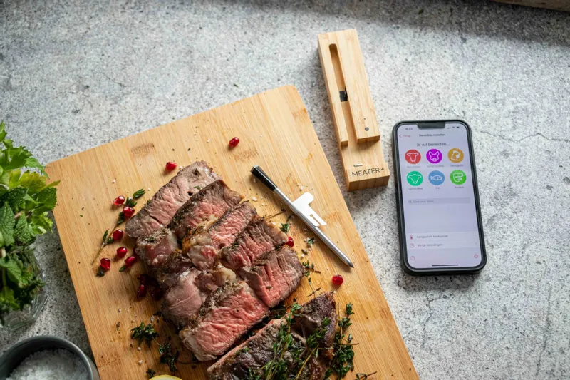 De MEATER+ is verbonden met de MEATER app waardoor het bakken en grillen van gerechten een gemakkelijk klusje wordt. De app is gratis te downloaden in de Appstore van iOS en Playstore van Android. In de MEATER app kun je gemakkelijk het gerecht kiezen wat je wilt bereiden en of je het rare, medium of well done gebakken wilt hebben. Door middel van een geavanceerd algoritme bepaalt de app de geschatte grilltijd van je gerecht. Verder neemt de app je mee door elke stap van het proces wat zorgt voor een gegarandeerd succes.