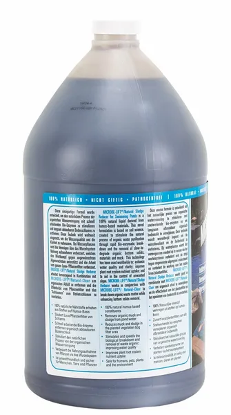 Natural Sludge Reducer voor zwemvijvers is een 100% natuurlijke vloeistof die wordt verkregen uit materialen op humus basis. Deze unieke formule is ontwikkeld om het natuurlijke proces van organische waterzuivering te stimuleren met snelwerkende bio-enzymen en om langzaam afbreekbaar organisch bodemslib te verwijderen. Deze techniek wordt wereldwijd ingezet om de waterkwaliteit en de helderheid te verbeteren.