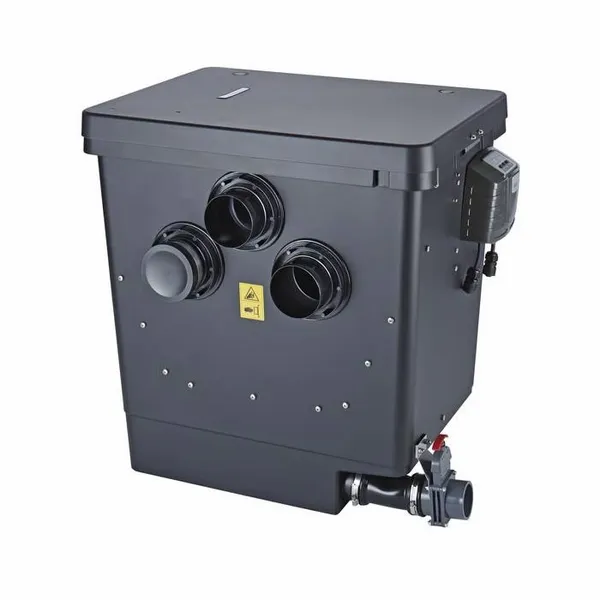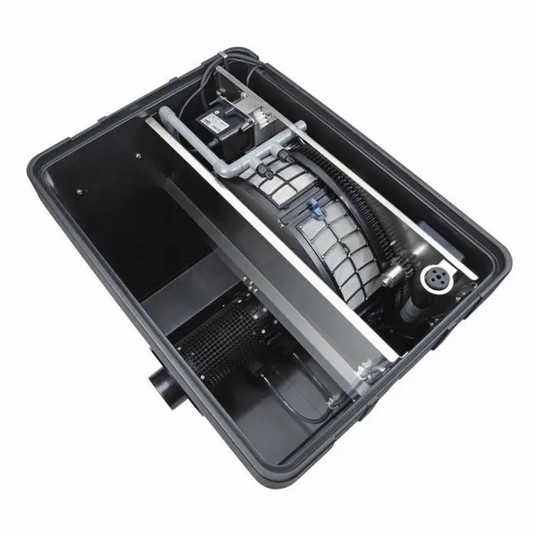 Dit complete vijverfilter is geschikt voor een gravitaire opstelling. Dit betekent dat je het grootste deel onder waterniveau kunt plaatsen. Dit maakt het systeem energiezuiniger en via een bodemdrain wordt het vuil op de bodem beter aangepakt. Het trommelfilter met bewegend bed plaats je bovendien makkelijker uit het zicht, doordat het slechts 10,5 cm boven het water uitkomt.