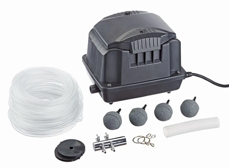 Met de Pontec PondoAir 1800 luchtpompset haal je een krachtige luchtpomp in huis voor je vijverleven. Deze set, met een krachtige capaciteit van 1800 liter per uur, voorziet vijvers tot 16.000 liter van het nodige zuurstof. De complete set bevat een luchtpomp, 4 x 5 meter luchtslangen, luchtverdeler, 4 cilindervormige uitstroomstenen, en 2 reservemembranen. Met een vermogen van 25 watt en een laag geluidsniveau, biedt de PondoAir 1800 een betrouwbare oplossing voor je vijver, die je zowel binnen als buiten kunt plaatsen. Daarnaast is deze luchtpomp TÜV-getest en heeft een IP 44 beschermingsklasse, waardoor hij bestand is tegen spatwater.
