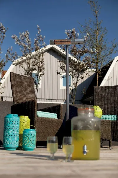 Het verwarmingselement van deze heater bestaat uit een rosé gold element. Dit betekent dat de terrasverwarmer intense warmte afgeeft door de reflectie van een laagje bladgoud op het verwarmingselement. Door de rosé goud afwerking geeft deze terrasverwarmer een zachte gloed. De terrasverwarmer straalt dus geen sterke rode gloed uit. Door de korte warmtegolf van dit verwarmingselement, wordt je lichaam van binnenuit verwarmd. Wind heeft geen invloed op het warmtebereik en jouw lichaamstemperatuur wordt binnen korte tijd verhoogd.