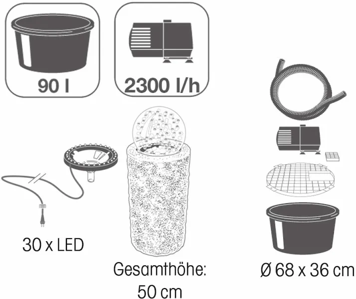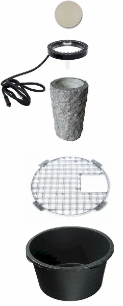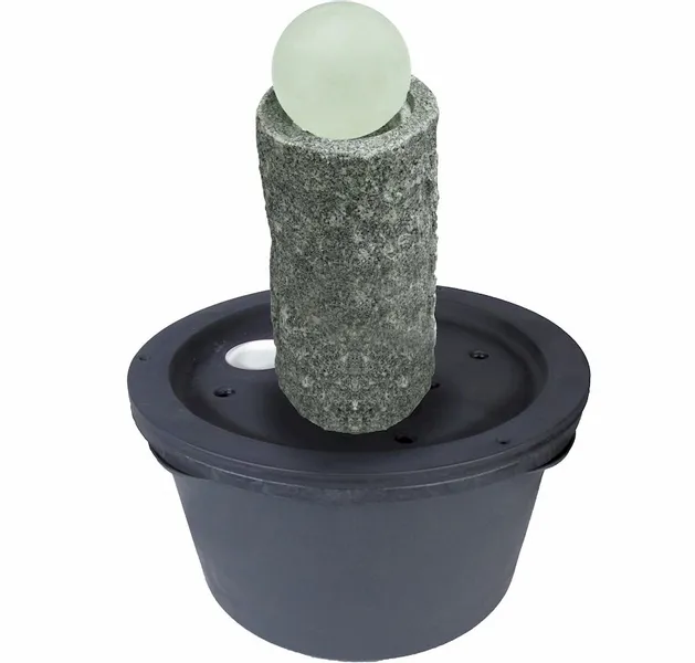 De set is voorzien van een pomp met een capaciteit van 2300 liter per uur. Krachtig genoeg om dit ornament goed te laten werken. De zuil plaats je boven een waterbassin met een inhoud van 90 liter. Doordat het water in dit bassin terecht komt, vormt het een gesloten systeem. Een uniek waterornament dat zeker niet misstaat in de tuin.