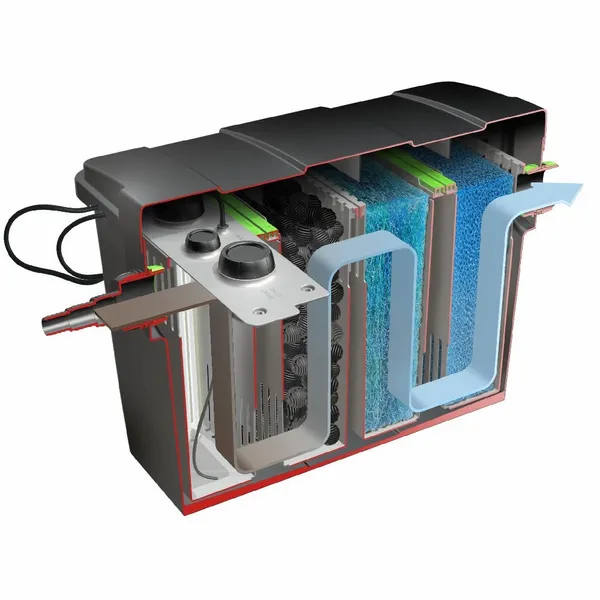 De Velda Giant Biofill XL maakt gebruik van een zeer uitgebreide viervoudige filtratie. Het vijverwater wordt achtereenvolgens door vier verschillende filterkamers geleid waarna het weer zal terugkeren in de vijver. Door de perfecte opbouw van deze filtermaterialen worden zelfs de kleinste vuildeeltjes uit het water verwijderd. Het vijverwater wordt achtereenvolgens langs een UV-C lamp (18 watt), bioballen, grove Japanse matten en Fijne Japanse matten geleid.