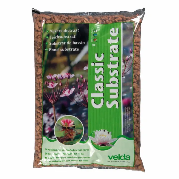 Met deze wetenschap heeft Velda het vijversubstraat samengesteld. Velda Classic Substrate is dan ook sinds jaren toonaangevend op het gebied van vijvervoedingsbodems. Het substraat heeft een open structuur en een groot intern oppervlak. Hierdoor wordt een maximale aangroei van micro-organismen verkregen. Verder garandeert een uitgekiende samenstelling met mineralen en sporenelementen een krachtige en constante groei van waterlelies en moerasplanten. Vijvers ingericht met dit vijversubstraat hebben duidelijk een snellere ontwikkeling van het biologisch evenwicht en uiteindelijk een heldere waterpartij.