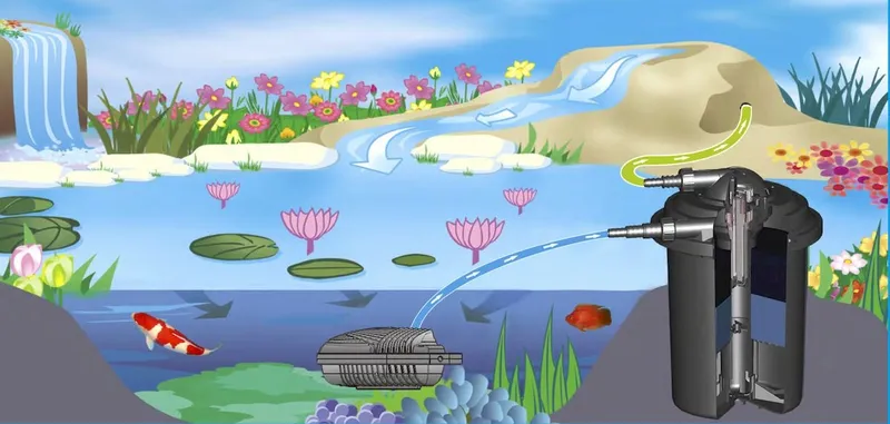Het grote voordeel van een drukfilter is dat je hem makkelijker uit het zicht plaatst. Het filter graaf je grotendeels in bij de vijver en met behulp van vijverslangen koppel je hem met je vijverpomp. Via het andere uiteinde laat je het vijverwater terugstromen in de vijver of voer je het op naar een waterval of beekloop.