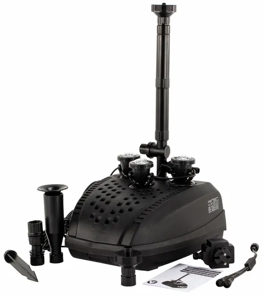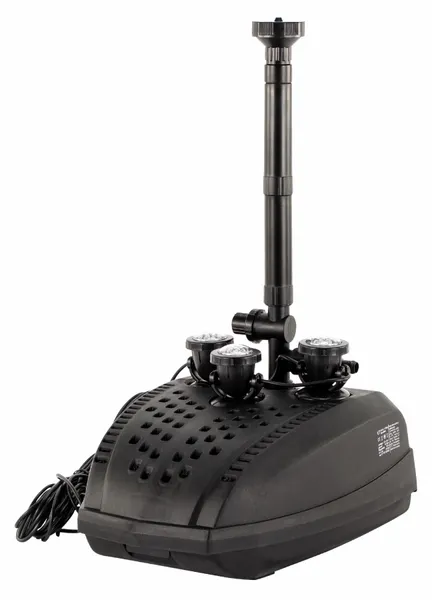 Na de filtering komt het vijverwater terecht bij de fontein, waarmee het water terug naar de vijver geleid wordt. Dit filter wordt geleverd met 3 verschillende fonteinkoppen, waardoor je kunt kiezen voor de fontein die het beste bij de vijver past. De filterset bevat een enkele sproeikop, dubbele sproeikop en een waterbel.