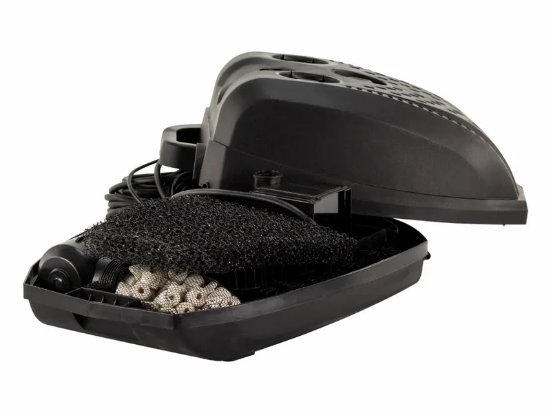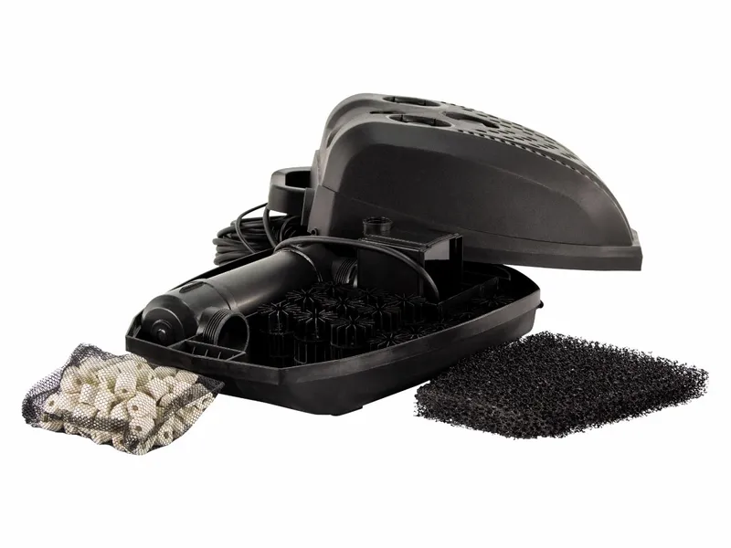 Om het vijverwater kraakhelder te krijgen vindt de filtering van het All-in-1 Filter Fountain plaats in verschillende fasen. Dit effectieve vijverfilter maakt namelijk gebruik van meervoudige filtratie. De eerste fase hierin is mechanische filtratie, waarbij de grove vuildeeltjes achterblijven in filterschuim. Daarna wordt het water geleid door biofilterballen en keramische filterpijpjes. Micro-organismen hechten zich op dit materiaal en zorgen voor een biologische filtering. De fijne vuildeeltjes worden hierdoor ook uit het water gefilterd.