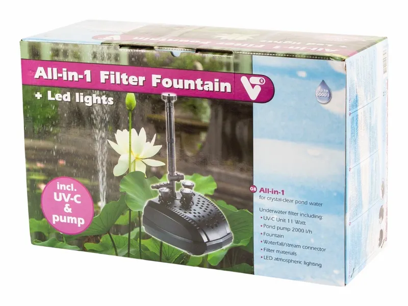 Ben je voor je vijver op zoek naar een complete set met vijverfilter, UV-C filter en fontein? Dan biedt het Velda VT Alles-in-één vijverfilter uitkomst. Dit is namelijk een complete alles-in-1 oplossing. Daarbij komt als leuke extra dat deze filterset voorzien is van ledverlichting om je vijver meer sfeer te geven. Dit vijverfilter is geschikt voor een vijver tot 6000 liter. De pomp met een capaciteit van 2000 liter per uur pompt het water door het filter.