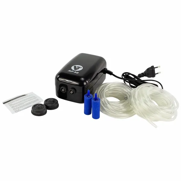 De Velda V-Tech luchtpompset AP-40 is een compacte luchtpomp met een vermogen van 5 watt en een capaciteit van 270 liter per uur. Deze luchtpompset met regelbare capaciteit is geschikt voor kleine vijvers met een maximale inhoud van 2700 liter. Met inbegrip van een luchtslang en twee luchtstenen, zorgt hij voor een effectieve beluchting van je wateromgeving. Het is belangrijk om deze luchtpomp op een droge plek boven het waterniveau te installeren om te voorkomen dat deze onder water komt, aangezien deze daar niet voor geschikt is.